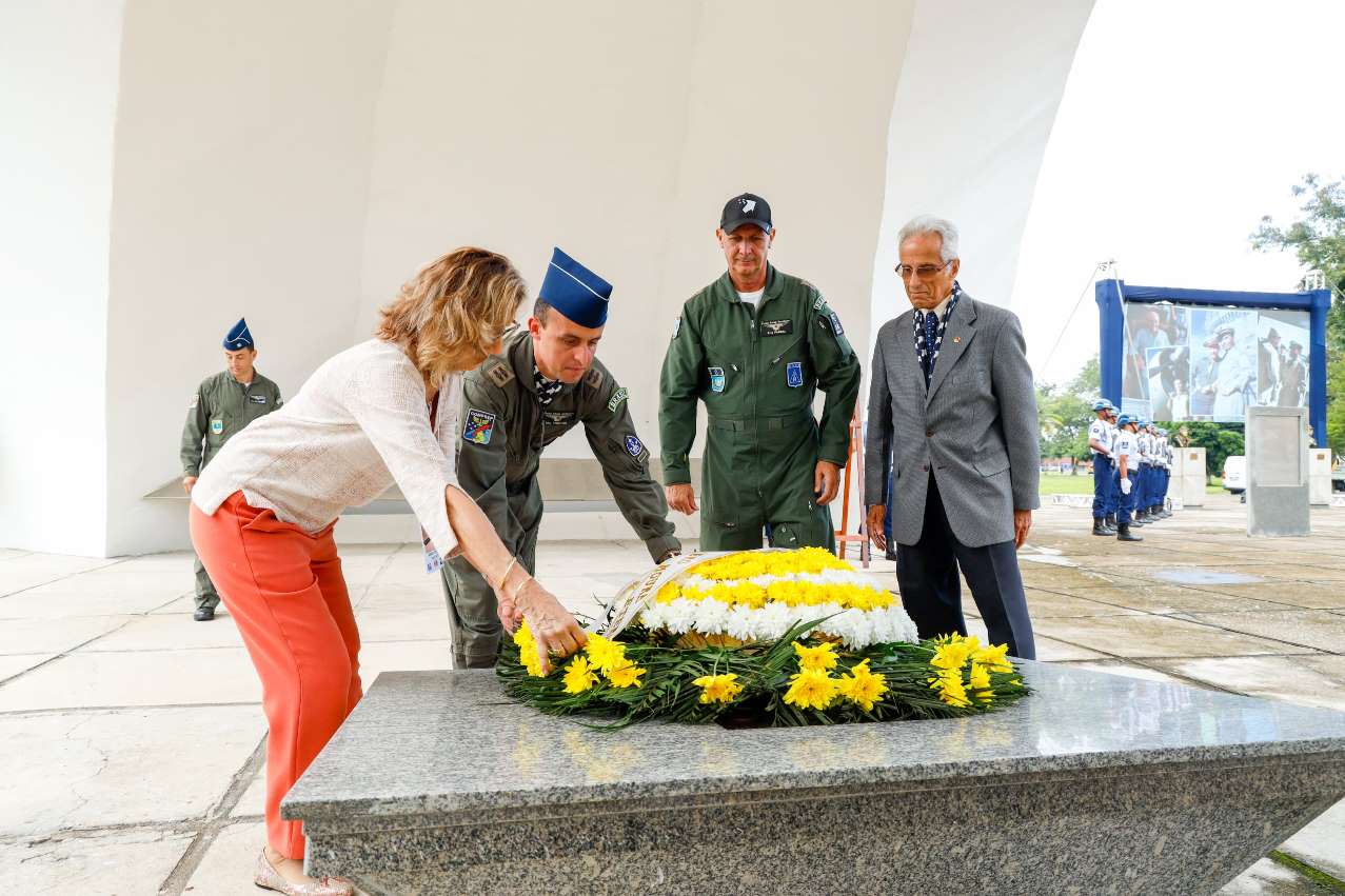 -> A aposição solene da coroa de flores no Memorial Senta a Púa pelo TB Farcic, Chefe do Estado-Maior da Aeronáutica, Sra. Leonor Moura, filha de nosso Patrono - Brig. Nero Moura, Brig. Quírico, presidente da ABRA-PC e Maj.-Av. Freitas, Cmt do 1º GAVCA.