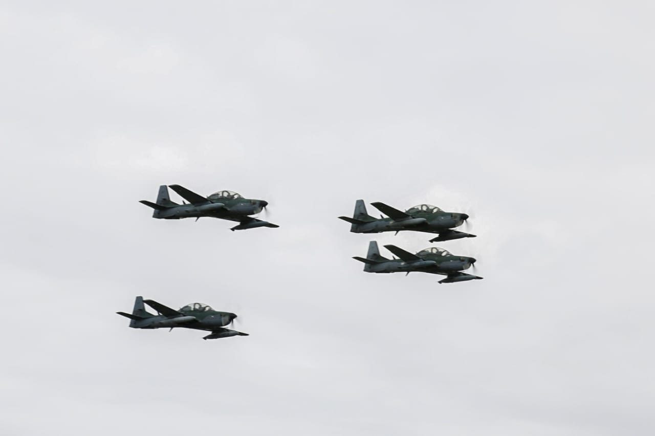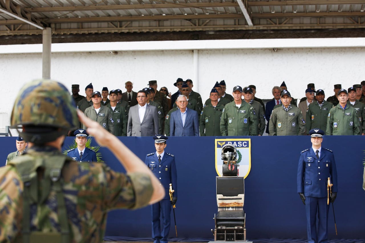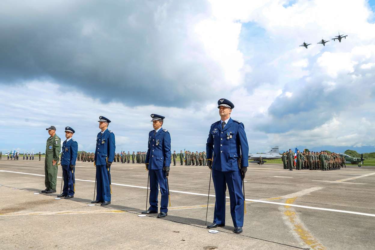 -> O sobrevoo na solenidade militar pelas aeronaves Gripen, F-5M, 1 A-1M e At-29.
